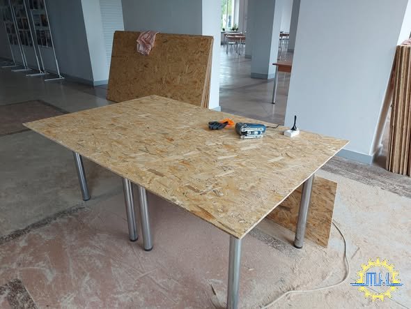 Звичайно, нам було б зручніше різати орієнтовано-стружкові плити на форматно-розкрійному верстаті кафедри. Але носити листи і порізані деталі між корпусами дуже не зручно.
