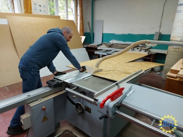Тому викладачі кафедри сьогодні підвищували свою кваліфікацію в обробці деревинних композитів - різали OSB в розмір розбитих вікон.